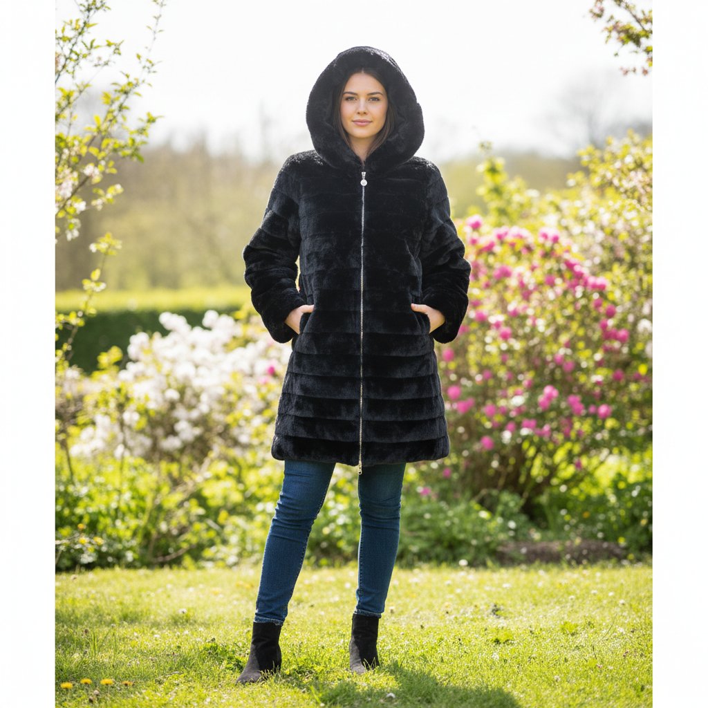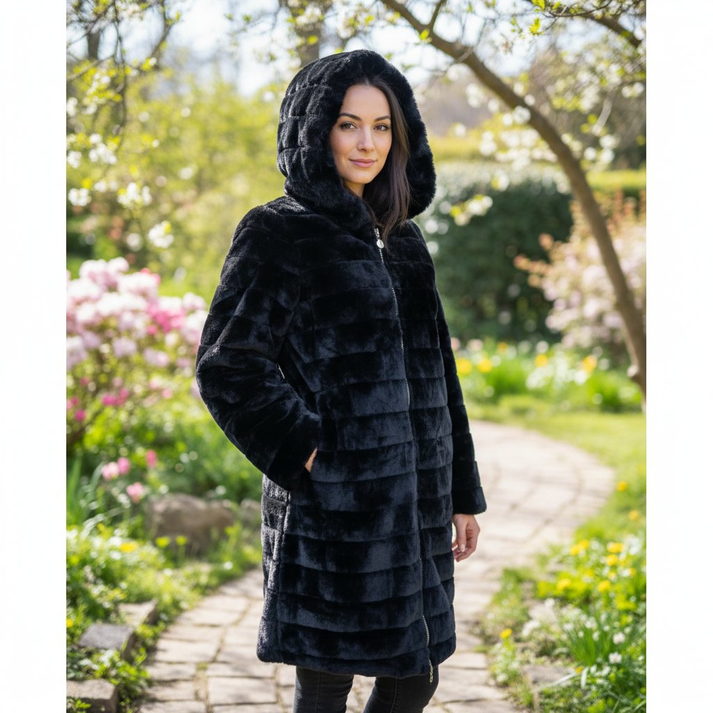 Dlouhý kabát se slabším kožíškem s kapucí z pařížské kolekce. Délka dosahuje úrovně kolen.
