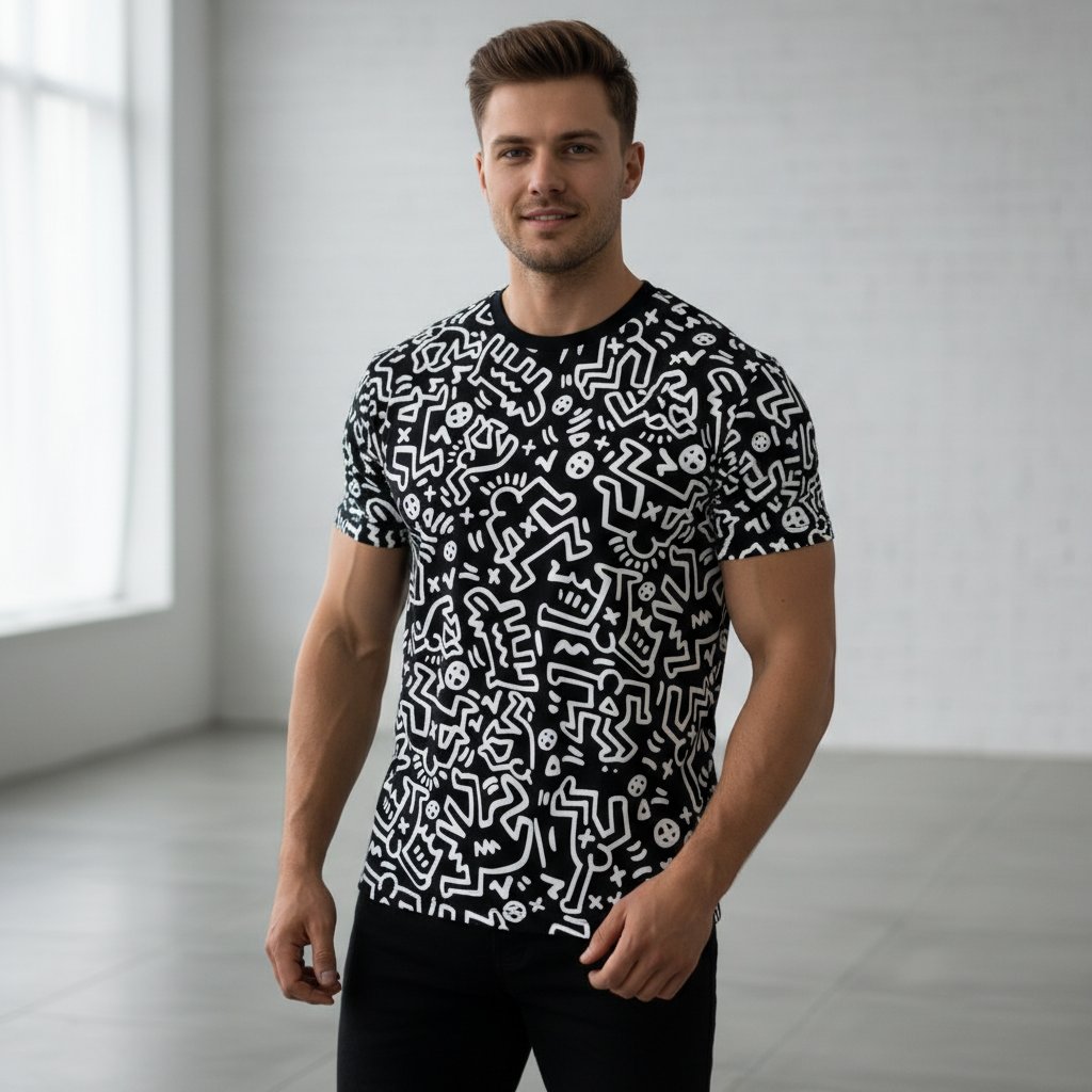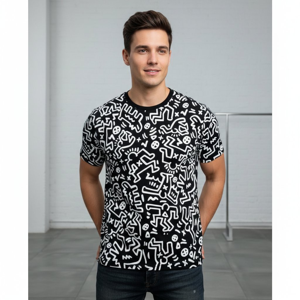 Toto stylové černobílý tričko s výrazným grafickým potiskem je ideálním doplňkem pro každého, kdo chce přidat trochu uměleckého flairu do svého šatníku. Vyrobeno ze 100% bavlny, zaručuje maximální pohodlí a prodyšnost. Krátké rukávy a klasický střih poskytují uvolněný a pohodlný outfit, který je vhodný pro každodenní nošení. Unikátní design s abstraktními vzory přitahuje pozornost a dělá z tohoto trička perfektní kousek pro vyjádření osobního stylu. Kombinujte ho s džínami nebo šortkami pro moderní a ležérní look.